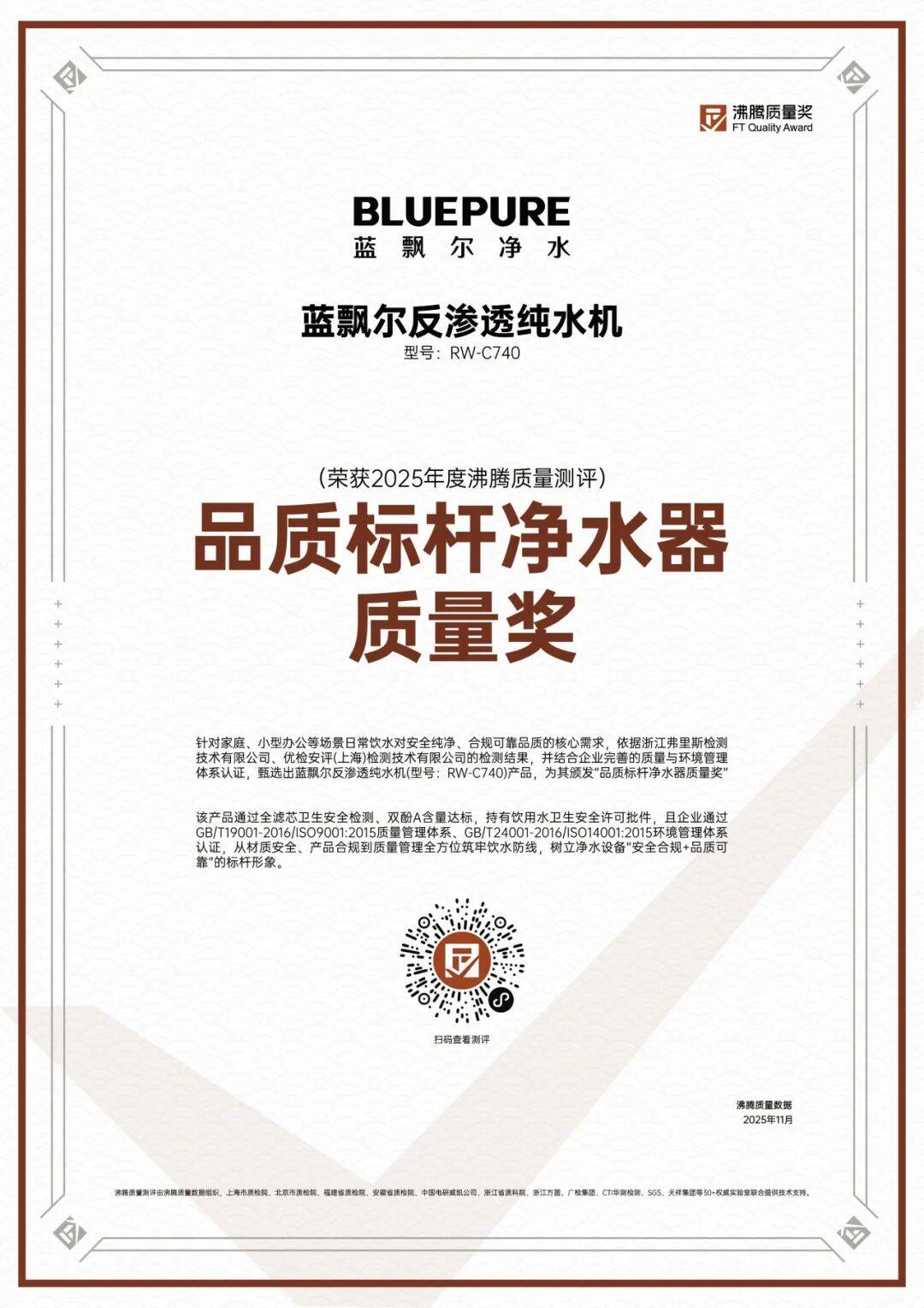 蓝飘尔反分泌纯水机正在 2025 年度欣喜质地测评中脱颖而出,荣获 “品德标杆清水器质地奖”,以全维度安好保护,适配家庭、小型办公等场景寻常饮水需求。